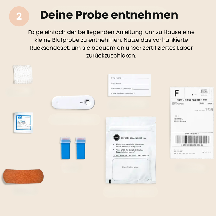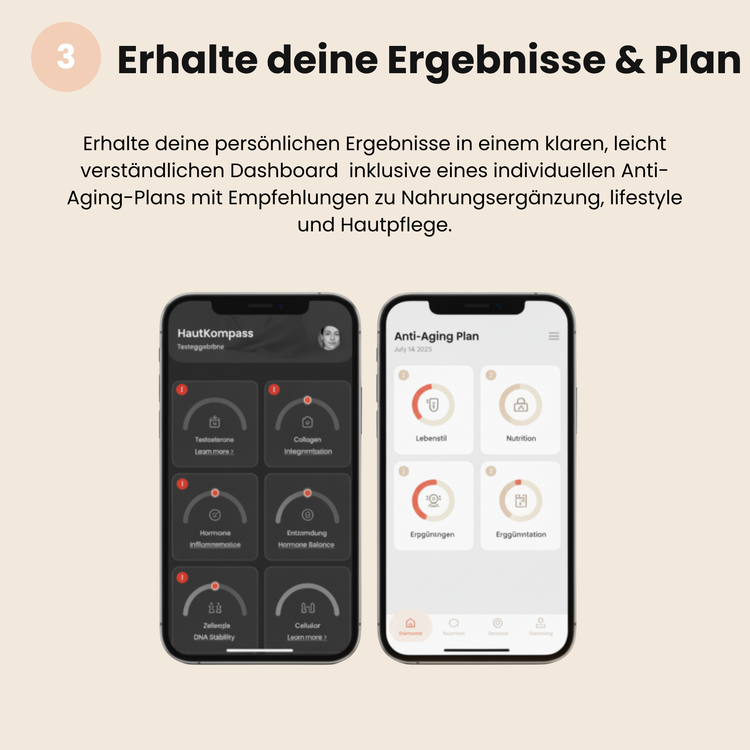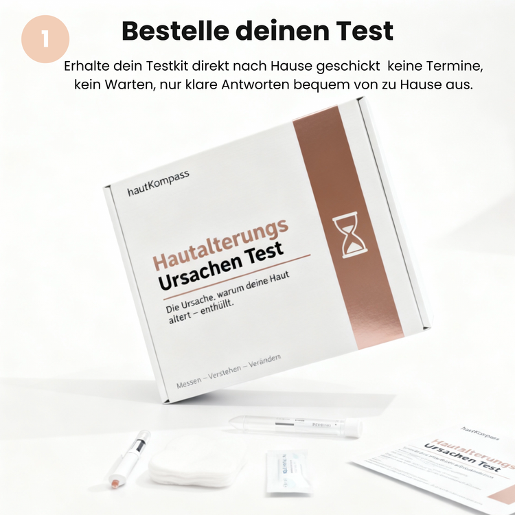 Ein Test für zu Hause, der die 8 zentralen Ursachen deiner Hautalterung sichtbar macht – Hormone, Stress, Entzündung, Kollagenabbau, oxidativer Stress, Nährstoffbalance, Zellenergie und DNA Stabilität – inklusive persönlichem Anti Aging Plan.